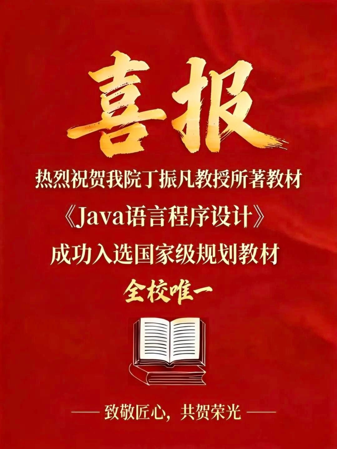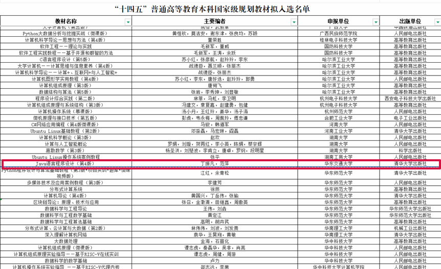 近日,教育部公示“十四五”普通高等教育本科国家级规划教材拟入选名单,信工学院丁振凡教授主编的《Java语言程序设计》成功入选,成为本次评选我校唯一入选教材。特此祝贺!